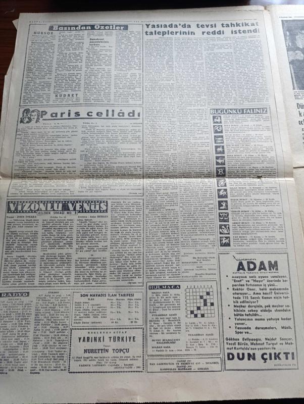 Son Havadis Gazetesi - 6 Temmuz 1961 - Bugün Dahil 3 Gün Siyasi Propaganda Yasak - Oy Sandıkları Başında Resmi Üniforma İle Bulunulmayacak - Fırıncılar Ekmeğe De Zam İstiyor - Kemal Kurdaş Korkuya Kapılıp Enflasyona Gitmeyeceğiz Dedi - Bulgar Casusu Yusuf Hocaoğlu Evvelce CHP Üyesi İmiş - Üç Kübalı Pilot Amerika'ya Kaçtı - Rektör Seçimleri İçin Bazı Öğretim Üyeleri Danıştaya Başvuracak - 3. Dünya Harbinin İçindeyiz Yazan Nejat Arıkan Yazı Dizisi - Eşsiz Bulutlar Yazan Françoise Sağan Yazı Dizisi - Türkiye'de Komünist Hareketleri Hazırlayan İlhan Darendelioğlu Yazı Dizisi - Cezayir'in Taksimine Mani Olmak İçin Müslümanlar Grev Yapıyor - General Mc. Arthur Manila'da Konuştu - Kuveyt Maliye Bakanı Kral Suud İle Görüşecek - Moskova Radyosu 10 Ay Önceki Haberleri Veriyor - Bozkurtların Ölümü Yazan Nihal Atsız - Fidel Castro'nun Kardeşi Raul Castro Suikastta Yaralandı - İsrail Bir Füze Fırlattı - Vizonlu Venüs Yazan John O'Hara Yazı Dizisi - En Çok Para Kazanan Aktristi Elizabeth Taylor - adlı eser, Kitap > Süreli Yayınlar > Gazeteler > Türkiye > Genel > Günlük kategorisinde İkinci El olarak satıştadır.