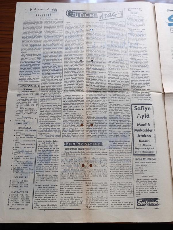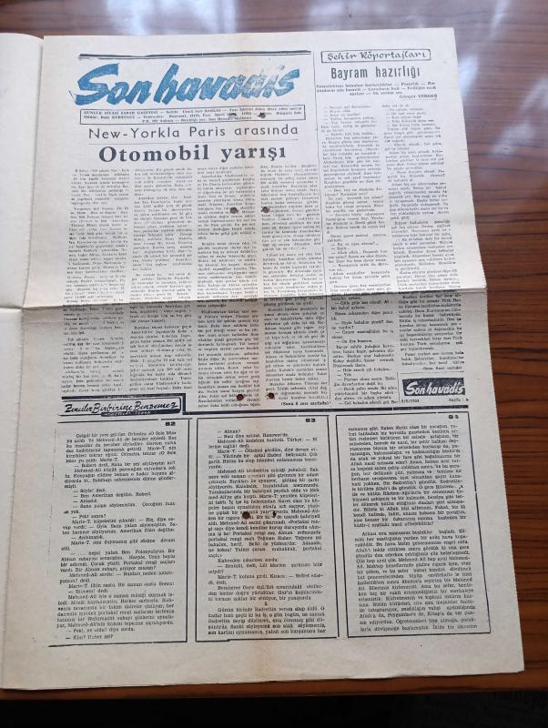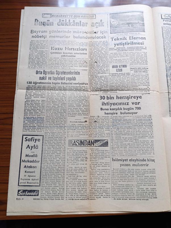 Son Havadis Gazetesi - 8 Ağustos 1954 - Gülünç Olmayalım Yazan Cemil Sait Barlas Köşe Yazısı - On İki Sınıfın Silah Altına Çağırılacağı Hakkındaki Haber Yalanlanıyor - Üçlü Balkan Anlaşmasının Pazartesi İmzalanıyor - Bikini Bu Dene Plajların Modası - Fuat Arna Dün Gece Tevkif Edildi - Florya Arsaları Meselesi Arsalarda Hissediyorum İlanlar İstifalarını Verdiler - İki Kadın Milliyetçi Fransız Polisin Öldürdüler - İngiliz Milletvekillerinin Vaziyeti Yazanlar John H. Mac Callum Scott - New York'la Paris Arasında Otomobil Yarışı - Zenciler Birbirine Benzemez Yazan Attila İlhan Yazı Dizisi - İslam Aleyhinde Kitap Yazan Yazar Jorj Şukyr - Zemzem Suyu Çıkarmaktadır İçin Mekke'de Artezyen Kuyuları Açıldı - Hikaye Karanlıkta Yazan A. Rıza Yalt - Demir Perdesi Yıkılıyor Yazan Pat Frank Yazı Dizisi - Profesyonel Bir Dolandırıcının Hikayesi Yazı Dizisi - Safiye Ayla Bomonti Çay Bahçesinde, Cemil Sait Barlas tarafından kaleme alınmıştır. Son Havadis Gazetesi - 8 Ağustos 1954 - Gülünç Olmayalım Yazan Cemil Sait Barlas Köşe Yazısı - On İki Sınıfın Silah Altına Çağırılacağı Hakkındaki Haber Yalanlanıyor - Üçlü Balkan Anlaşmasının Pazartesi İmzalanıyor - Bikini Bu Dene Plajların Modası - Fuat Arna Dün Gece Tevkif Edildi - Florya Arsaları Meselesi Arsalarda Hissediyorum İlanlar İstifalarını Verdiler - İki Kadın Milliyetçi Fransız Polisin Öldürdüler - İngiliz Milletvekillerinin Vaziyeti Yazanlar John H. Mac Callum Scott - New York'la Paris Arasında Otomobil Yarışı - Zenciler Birbirine Benzemez Yazan Attila İlhan Yazı Dizisi - İslam Aleyhinde Kitap Yazan Yazar Jorj Şukyr - Zemzem Suyu Çıkarmaktadır İçin Mekke'de Artezyen Kuyuları Açıldı - Hikaye Karanlıkta Yazan A. Rıza Yalt - Demir Perdesi Yıkılıyor Yazan Pat Frank Yazı Dizisi - Profesyonel Bir Dolandırıcının Hikayesi Yazı Dizisi - Safiye Ayla Bomonti Çay Bahçesinde adlı eser Türkçe dilindedir.