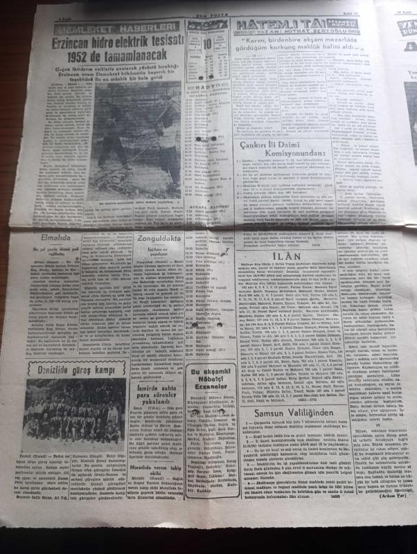 Son Posta Gazetesi - 10 Eylül 1951 - Yavuz hırsızlar yazan Selim Ragıp Emeç Başmakale - Amerika Japonya ile Dün bir güvenlik Anlaşması imzaladı - Demokrat Parti'nin kazanma şansı Gün geçtikçe artıyor - Bilecik'te CHP köylüleri silahla tehdit ettiriyor - Beşiktaş Barbaros meydanında konuşan Demokrat Parti hatibi fotoğraf - Başbakan Adnan Menderes yarın İstanbul'a geliyor - İzmir'in kurtuluş yıldönümü büyük tezahüratla kutlandı fotoğraf - bakkal kurnazlığı yazan Mithat Cemal Kuntay - Kurban Bayramı hazırlığı - Karagümrük kulübü'nün Spor Bayramı - Amerika Mançuryanın bombalanmasını istiyor - Kore gazilerine madalya verilecek - Süveyş ve İsrail meselelerindeki durumumuz - Turgay Şeren Galatasaray'dan ayrılmadı - Beşiktaş 7 Beyoğluspor 3 - İstanbul Ankara Radyosu programı - bu akşamki nöbetçi eczaneler - yeni dünyada ilk Türk pehlivanı yazan Kerim Kanok - Erzincan hidroelektrik tesisatı 1952'de tamamlanacak - memur ve politika yazan Orhan Mete - Sümerbank - Aydın'da Cavit Oral ağır konuştu, Ali Ekrem Uşaklıgil tarafından kaleme alınmıştır. Son Posta Gazetesi - 10 Eylül 1951 - Yavuz hırsızlar yazan Selim Ragıp Emeç Başmakale - Amerika Japonya ile Dün bir güvenlik Anlaşması imzaladı - Demokrat Parti'nin kazanma şansı Gün geçtikçe artıyor - Bilecik'te CHP köylüleri silahla tehdit ettiriyor - Beşiktaş Barbaros meydanında konuşan Demokrat Parti hatibi fotoğraf - Başbakan Adnan Menderes yarın İstanbul'a geliyor - İzmir'in kurtuluş yıldönümü büyük tezahüratla kutlandı fotoğraf - bakkal kurnazlığı yazan Mithat Cemal Kuntay - Kurban Bayramı hazırlığı - Karagümrük kulübü'nün Spor Bayramı - Amerika Mançuryanın bombalanmasını istiyor - Kore gazilerine madalya verilecek - Süveyş ve İsrail meselelerindeki durumumuz - Turgay Şeren Galatasaray'dan ayrılmadı - Beşiktaş 7 Beyoğluspor 3 - İstanbul Ankara Radyosu programı - bu akşamki nöbetçi eczaneler - yeni dünyada ilk Türk pehlivanı yazan Kerim Kanok - Erzincan hidroelektrik tesisatı 1952'de tamamlanacak - memur ve politika yazan Orhan Mete - Sümerbank - Aydın'da Cavit Oral ağır konuştu adlı eser Türkçe dilindedir.