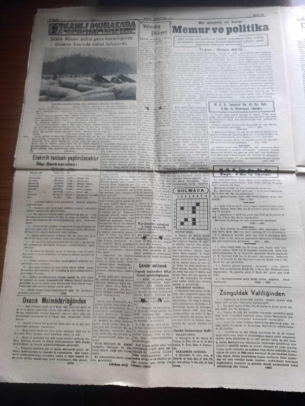 Son Posta Gazetesi - 10 Eylül 1951 - Yavuz hırsızlar yazan Selim Ragıp Emeç Başmakale - Amerika Japonya ile Dün bir güvenlik Anlaşması imzaladı - Demokrat Parti'nin kazanma şansı Gün geçtikçe artıyor - Bilecik'te CHP köylüleri silahla tehdit ettiriyor - Beşiktaş Barbaros meydanında konuşan Demokrat Parti hatibi fotoğraf - Başbakan Adnan Menderes yarın İstanbul'a geliyor - İzmir'in kurtuluş yıldönümü büyük tezahüratla kutlandı fotoğraf - bakkal kurnazlığı yazan Mithat Cemal Kuntay - Kurban Bayramı hazırlığı - Karagümrük kulübü'nün Spor Bayramı - Amerika Mançuryanın bombalanmasını istiyor - Kore gazilerine madalya verilecek - Süveyş ve İsrail meselelerindeki durumumuz - Turgay Şeren Galatasaray'dan ayrılmadı - Beşiktaş 7 Beyoğluspor 3 - İstanbul Ankara Radyosu programı - bu akşamki nöbetçi eczaneler - yeni dünyada ilk Türk pehlivanı yazan Kerim Kanok - Erzincan hidroelektrik tesisatı 1952'de tamamlanacak - memur ve politika yazan Orhan Mete - Sümerbank - Aydın'da Cavit Oral ağır konuştu adlı eser, Kitap > Süreli Yayınlar > Gazeteler > Türkiye > Genel > Günlük kategorisinde İkinci El olarak satıştadır.