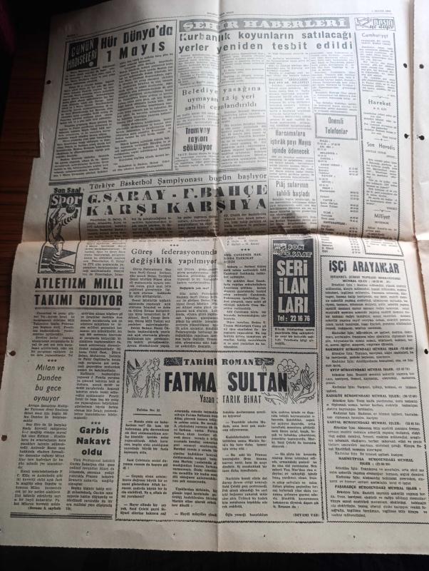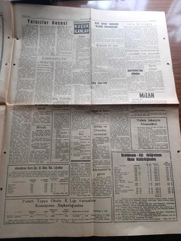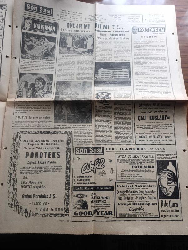 Son Saat Gazetesi - 1 Mayıs 1963 - Haldeki Milyonluk Oyun Başkan Necdet Uğur'un işe el koyması bekleniyor - Bakırköy Akıl Hastanesinde Napolyon Tablosu - Dış memleketlere gitmek için 96 bin işçi sıra bekliyor - Bahar Bayramı Emirgan korusu'nda büyük neşe içinde kutlandı fotoğraf - trafik kazası geçiren Lale Oraloğlu mucize kabilinden kurtuldu fotoğraf - Makarios İle Doktor Fazıl Küçük görüştü - Krutçef İle Fidel Castro arasındaki görüşme çok samimi geçmiş - hür dünyada 1 Mayıs - basketbolda Galatasaray Fenerbahçe karşı karşıya - atletizm milli takımı gidiyor - Garbis Zakaryan Nakavt oldu - sanatkar kardeşler Çalıkuşları Şehzadebaşı Kulüp Sinemasında - Foto Sema - edebiyatçılar birliği'nin edebiyat gecesi - Tamer Yiğit Türkan Şoray çapkın Kız filminde fotoğraf - Muhterem Nur ve Ahmet Mekin gurbet yolcularında fotoğraf - Göksel Arsoy fotoğraf - Fatma Girik ve Orhan Günşiray bir hizmetçi kızın hatıra defterinin sahnesinde fotoğraf - Suphi Kaner iyileşti - Dünyada ilk televizyon festivali, Nazım Özbay tarafından kaleme alınmıştır. Son Saat Gazetesi - 1 Mayıs 1963 - Haldeki Milyonluk Oyun Başkan Necdet Uğur'un işe el koyması bekleniyor - Bakırköy Akıl Hastanesinde Napolyon Tablosu - Dış memleketlere gitmek için 96 bin işçi sıra bekliyor - Bahar Bayramı Emirgan korusu'nda büyük neşe içinde kutlandı fotoğraf - trafik kazası geçiren Lale Oraloğlu mucize kabilinden kurtuldu fotoğraf - Makarios İle Doktor Fazıl Küçük görüştü - Krutçef İle Fidel Castro arasındaki görüşme çok samimi geçmiş - hür dünyada 1 Mayıs - basketbolda Galatasaray Fenerbahçe karşı karşıya - atletizm milli takımı gidiyor - Garbis Zakaryan Nakavt oldu - sanatkar kardeşler Çalıkuşları Şehzadebaşı Kulüp Sinemasında - Foto Sema - edebiyatçılar birliği'nin edebiyat gecesi - Tamer Yiğit Türkan Şoray çapkın Kız filminde fotoğraf - Muhterem Nur ve Ahmet Mekin gurbet yolcularında fotoğraf - Göksel Arsoy fotoğraf - Fatma Girik ve Orhan Günşiray bir hizmetçi kızın hatıra defterinin sahnesinde fotoğraf - Suphi Kaner iyileşti - Dünyada ilk televizyon festivali adlı eser Türkçe dilindedir.