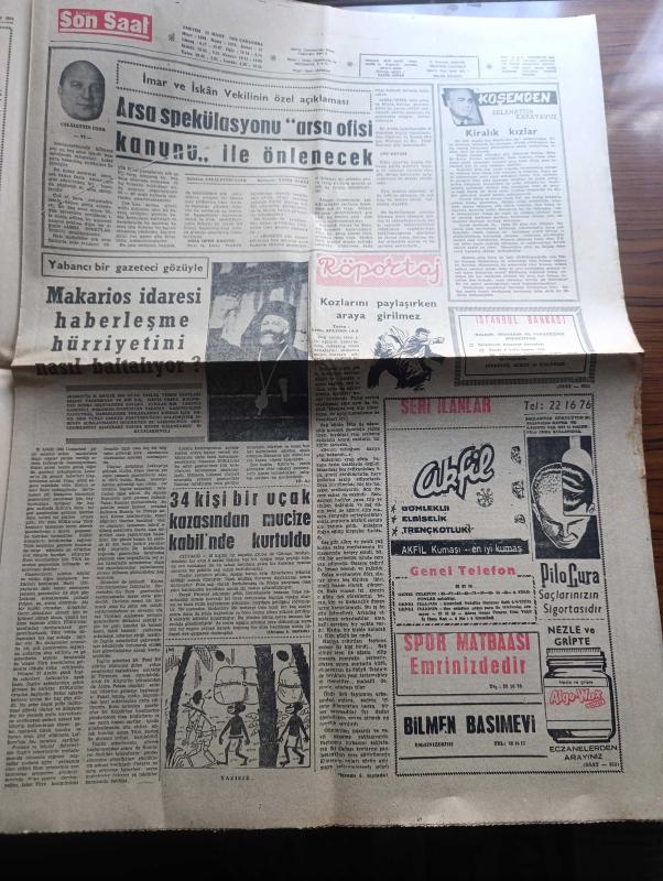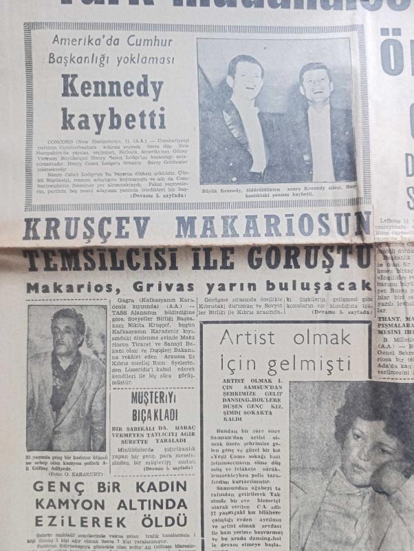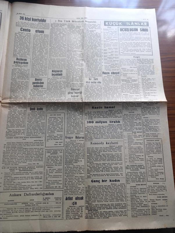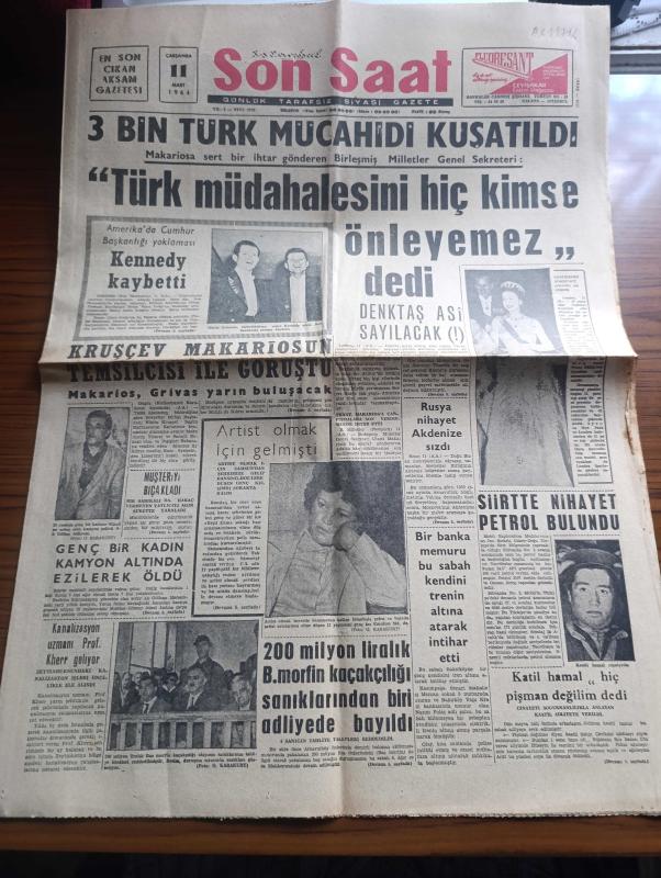 Son Saat Gazetesi - 11 Mart 1964 - 3 Bin Türk mücahiti kuşatıldı - Makariosa sert bir ihtar gönderen Birleşmiş Milletler Genel sekreteri Utant Türk müdahalesini hiç kimse önleyemez dedi - Rauf Denktaş asi sayılacak - Amerikan cumhurbaşkanlığı yoklaması Kennedy kaybetti fotoğraf - Kruşçev Makariosun temsilcisi ile görüştü - kanalizasyon uzmanı Profesör Kherr geliyor - İngiltere kraliçesi'nin dördüncü çocuğu da erkek olacak - Siirt'te Nihayet petrol bulundu - İstanbul'da sinema tiyatro programı - kiralık kızlar yazan Selahattin Karayavuz - Romy Scheider'in yeni flörtü Amerikalı fotoğraf - Göksel Ersoy ve Türkan Şoray fotoğraf - Tamer Yiğit fotoğraf - Erol Taş Ve Suzan Avcı fotoğraf - Billur köşk adlı film vizyona girdi - Sunay Sun 2. Osman'da Büyük bir rol oynuyor fotoğraf - Galatalı Fatma filminin başrolünü Tanju Gürsu ile Fatma Girik paylaşıyor - Beşiktaş antrenörü tam selahiyet istiyor - Patterson boks şampiyonluğunu Clay'den alırsa bunu tasnifte birinci olana verecekmiş, Nazım Özbay tarafından kaleme alınmıştır. Son Saat Gazetesi - 11 Mart 1964 - 3 Bin Türk mücahiti kuşatıldı - Makariosa sert bir ihtar gönderen Birleşmiş Milletler Genel sekreteri Utant Türk müdahalesini hiç kimse önleyemez dedi - Rauf Denktaş asi sayılacak - Amerikan cumhurbaşkanlığı yoklaması Kennedy kaybetti fotoğraf - Kruşçev Makariosun temsilcisi ile görüştü - kanalizasyon uzmanı Profesör Kherr geliyor - İngiltere kraliçesi'nin dördüncü çocuğu da erkek olacak - Siirt'te Nihayet petrol bulundu - İstanbul'da sinema tiyatro programı - kiralık kızlar yazan Selahattin Karayavuz - Romy Scheider'in yeni flörtü Amerikalı fotoğraf - Göksel Ersoy ve Türkan Şoray fotoğraf - Tamer Yiğit fotoğraf - Erol Taş Ve Suzan Avcı fotoğraf - Billur köşk adlı film vizyona girdi - Sunay Sun 2. Osman'da Büyük bir rol oynuyor fotoğraf - Galatalı Fatma filminin başrolünü Tanju Gürsu ile Fatma Girik paylaşıyor - Beşiktaş antrenörü tam selahiyet istiyor - Patterson boks şampiyonluğunu Clay'den alırsa bunu tasnifte birinci olana verecekmiş adlı eser Türkçe dilindedir.