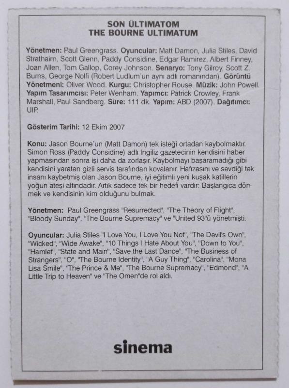 Son ültimatom / The bourne ultımatum - Matt Damın & Julia Stiles ~ [ SİNEMA KARTI ], en son 4 ay önce güncellenmiştir.
