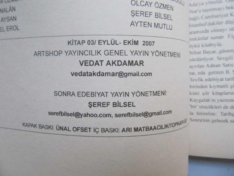 Kitap 2007 yılında Artshop tarafından yayınlanmıştır. Sonra Edebiyat Sayı: 3 (Haydar Ergülen ile Söyleşi/Şükrü Sever ile Söyleşi/Mehmet Bozgan ile Söyleşi/Emel İrtem ile Söyleşi/Can Yücel-Fazıl Güngör) adlı eser Türkçe dilindedir.
