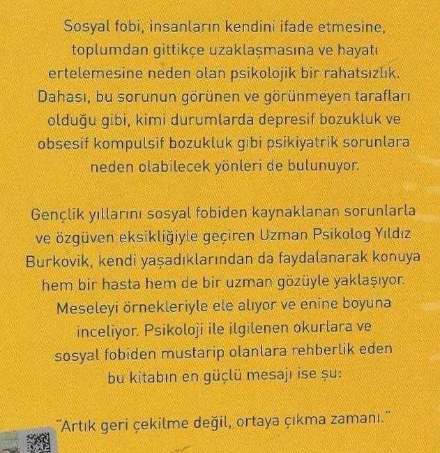 Sosyal fobi Görünen ve görünmeyen yönleri, Yıldız Burkovik tarafından kaleme alınmıştır. Kitap 2016 yılında Timaş tarafından [İstanbul] 978-975-263-005-5 ISBN kodu ile yayınlanmıştır. 182 sayfadır. Sosyal fobi Görünen ve görünmeyen yönleri adlı eser Türkçe dilindedir.