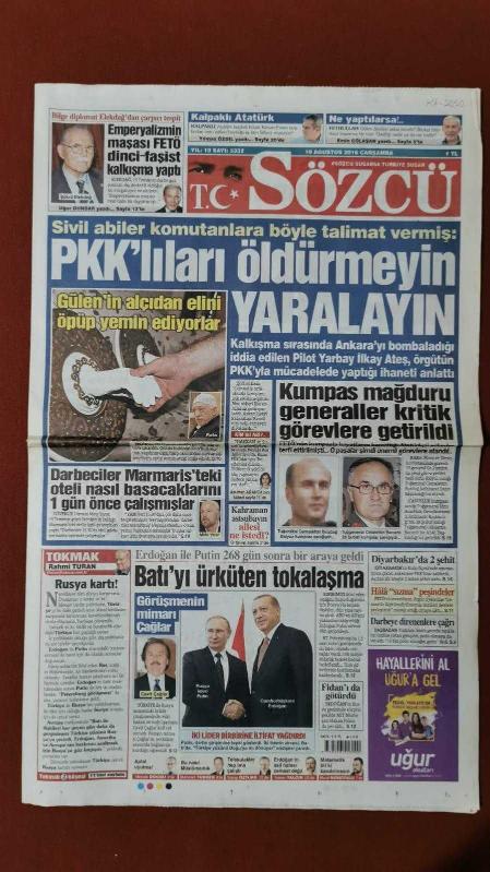 Kitap 2016 yılında yayınlanmıştır. 20 sayfadır. Sözcü Gazete 10 Ağustos 2016 PKK'lıları Öldürmeyin Yaralayın,Fetullah Gülen,Vladimir Putin,Recep Tayyip Erdoğan,Cavit Çağlar,Mete Yarar,Revizyona Tam Gaz Devam,Selçuk İnan,Emre Çolak,Burak Yılmaz,Felipe Melo,Wesley Sneijder,Blerim Dzemaili,Luis Cavanda,Loic Remy,Samuel Eto,Jose Sosa,Mete Gazoz,Antonija Misura,Paul Pogba,Real Madrid 3-2 Sevilla Süper Kupa Finali,Uğur Dündar,Numan Kurtulmuş adlı eser Türkçe dilindedir.