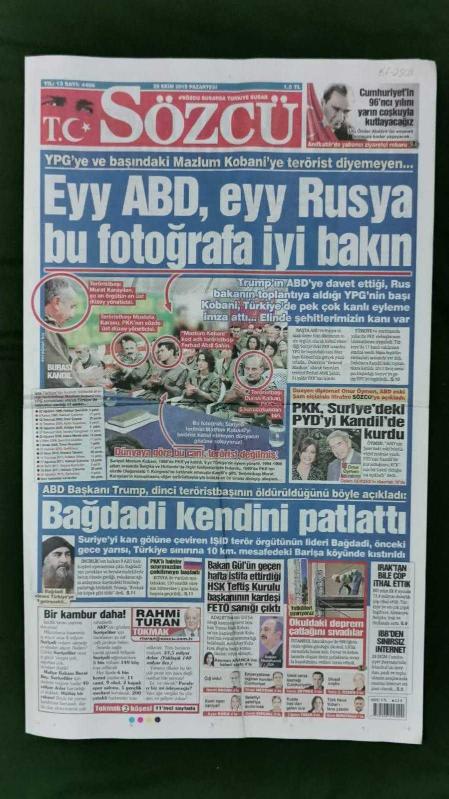 Sözcü Gazete 28 Ekim 2019 EYY ABD EYY Rusya Bu Fotoğrafa İyi Bakın,Duran Kalkan,Murat Karayılan,Mustafa Karasu,Ferhad Abdi Şirin,El Bağdadi,Abdülhamit Gül,Adem Ljajic,Adem Büyük,Umut Nayir,Fatih Terim,Abdullah Avcı,Beşiktaş Futbol Takımı,Beşiktaş 1-0 Galatasaray,Süleyman Demirel,Uğur Dündar,İstanbul Büyükşehir Belediye 29 Ekim Reklamı adlı eser, Kitap > Süreli Yayınlar > Gazeteler > Türkiye > Genel > Günlük kategorisinde İkinci El olarak satıştadır.