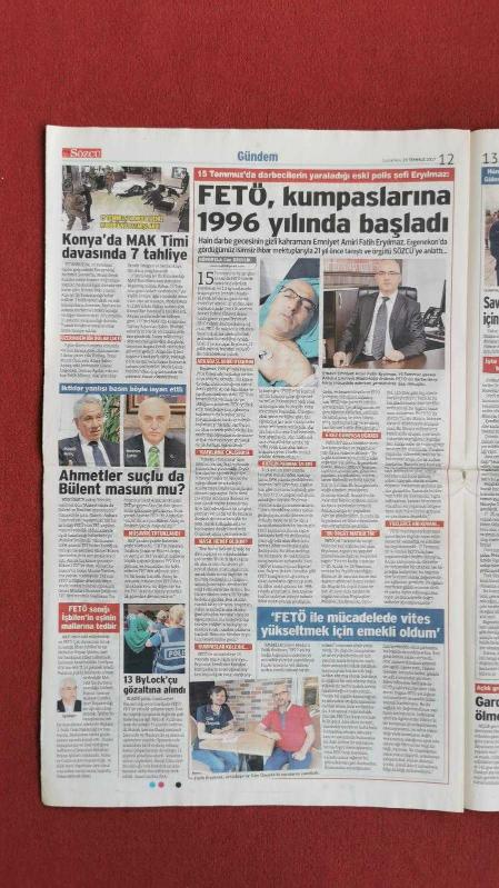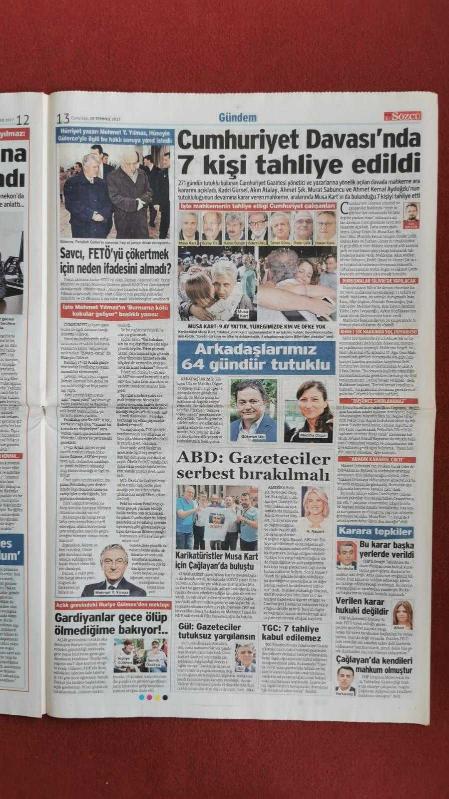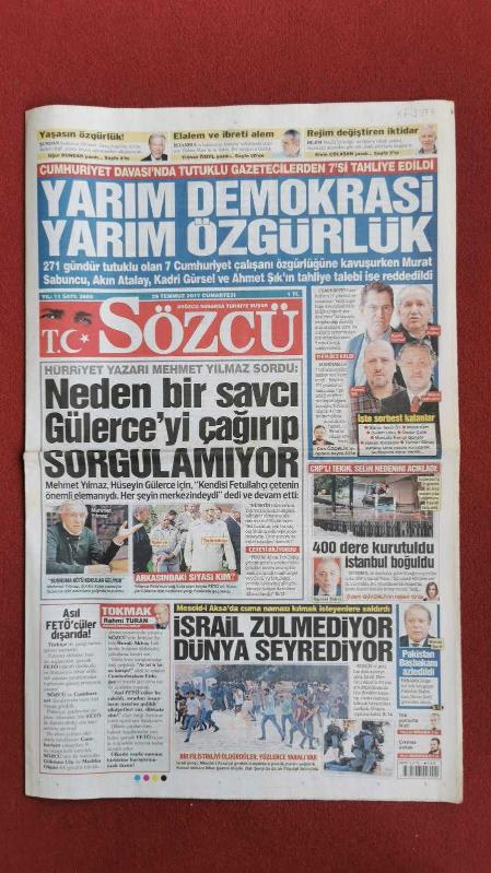 Sözcü Gazete 29 Temmuz 2017 Yarım Demokrasi Yarım Özgürlük,Ahmet Şık,Kadri Gürsel,Akın Atalay,Murat Sabuncu,Mehmet Yılmaz,Fethullah Gülen,Gürsel Tekin,Navaz Şerif,Yıldırım Demirören,Fatih Terim,Dursun Özbek,Mathieu Valbuena,Kylian Mbappe,Gülnara Kerimova,Bülent Arınç,İbrahim Şahin,Kadir Topbaş adlı eser, Kitap > Süreli Yayınlar > Gazeteler > Türkiye > Genel > Günlük kategorisinde İkinci El olarak satıştadır.
