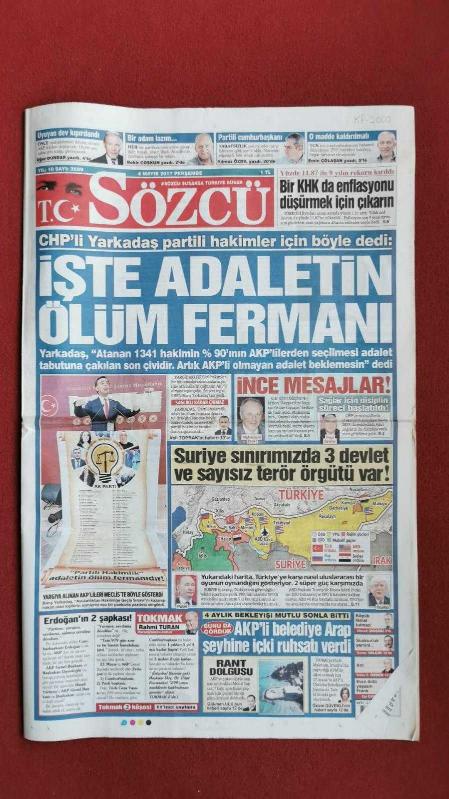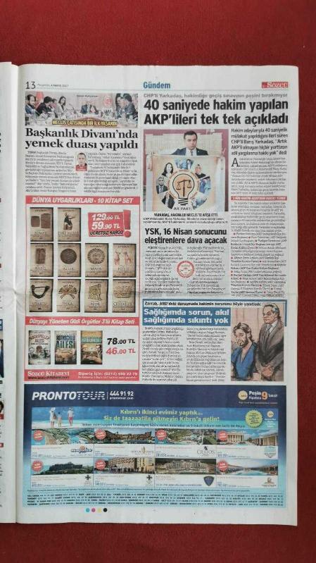 Kitap 2017 yılında yayınlanmıştır. 20 sayfadır. Sözcü Gazete 4 Mayıs 2017 İşte Adaletin Ölüm Fermanı Barış Yarkadaş,Vladimir Putin,Donald Trump,Muharrem İnce,Josef De Souza,Ryan Babel,Abdurrahim Albayrak,Ahmet Özdoğan,Adnan Öztürk,Bruma,Fenerbahçe Ve Galatasaray Voleybol Takımı,Vatan Şaşmaz,Ekpe Udoh,Recep Tayyip Erdoğan,Angela Merkel,Mesut Barzani,Ertuğrul Akbay adlı eser Türkçe dilindedir.