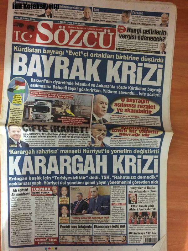 Sözcü Gazetesi, 1 Mart 2017, Uğur Dündar, Bekir Coşkun, Yılmaz Özdil, Emin Çölaşan, Dr. Nedim Türkmen, Saygı Öztürk, Rahmi Turan, Necati Doğru, Soner Yalçın, Mustafa Mutafaoğlu, Sanatçı El Öpmez, Kendini İndirmeye Kalkıyor, Şenol Güneş, Fikret Orman, Ahmet Ürkmezgil, Mustafa Kemal Atatürk Spor Salonu, UEFA Avrupa Ligi, Anderson Talisca, Demba Ba, Caner Erkin, Sneijder, Galatasaray, Beşiktaş, Atiba, Ersan Gülüm, Dursun Özbek, Lukas Podolski, Vissel Kobe, Volkan Demirel, Aziz Yıldırım, Advocaat, Kasımpaşa, Çaykur Rize, Popov, Koita adlı eser Türkçe dilindedir.