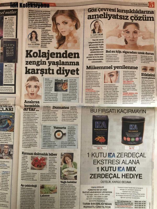 Sözcü Gazetesi, 14 Ocak 2018, Ayşe Gül Güven, Pınar Turan, Dr. Eylem Acar, Özlem Gürses, Kahraman Tazeoğlu, Birgan Bileken, Nur Fettahoğlu, Aytaç Akyurt, Jehan Barbur, Sercan Meriç, Dinçer Güner, Yaşlanma Karşıtı Diyet, Erkeklere Pembe Okul Projesi, Altın Küre Dokunuşuyla Daha Genç Bir Görünüme Kavuşmak Mümkün, Göz Çevresi Kırışıklıklarına Ameliyatsız Çözüm, Mavi Adamlar'ın Anlattıkları, Daha İyi Bir Hayat İçin 'At Onu Elinden', Tırnak Deyip Geçme, İnceliklerini Bilince Aşkı Yaşamak Daha Da Zorlaşıyor, Tam Sayfa Bulmaca Da TV Ekranı 7de, Sessiz Çığlıklar Atan Kadınları Düşündüm, Artık İstanbul Bana İyi Gelmiyor, Haftanın Aşıkları Başak ve Oğlak Burçları adlı eser, Kitap > Süreli Yayınlar > Gazeteler kategorisinde İkinci El olarak satıştadır.
