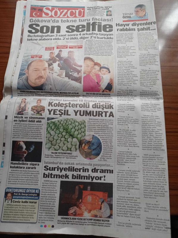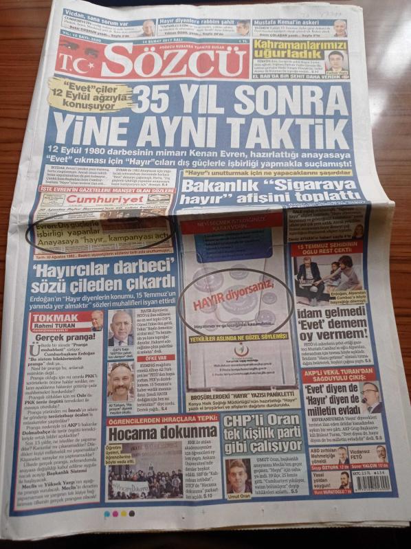 Sözcü Gazetesi - 14 Şubat 2017 - Beşiktaş Teknik Direktörü Şenol Güneş 74 Puan Şampiyon Yapar - 15 Temmuz Şehidinin Oğlu Rest Çekti İdam Gelmedi Evet Demem Oy Vermem - Evet'çiler 12 Eylül Ağzıyla Konuşuyor - 35 Yıl Sonra Aynı Taktik - Hayırcılar Darbeci Sözü Çileden Çıkardı - Bakanlık Sigaraya Hayır Afişi Toplattı - Özgür Suriye ordusu - Recep Tayyip Erdoğan - Hocama Dokunma adlı eser Türkçe dilindedir.