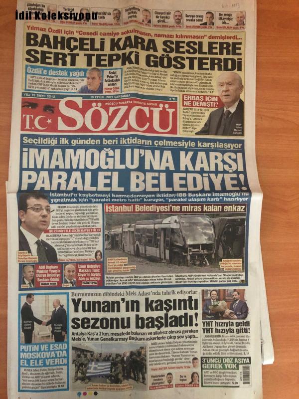 Sözcü Gazetesi, 15 Eylül 2021, Uğur Dündar, Soner Yalçın, Deniz Zeyrek, Emin Colasan, Yılmaz Özdil, Cemal Enginyurt, Ali Mahir Başarır, Ebubekir Sifil, Ahmet Tahiroğlu, Devlet Bahçeli, Mansur Yavas, İmamoğlu, İbrahim Özkan, Tunc Soyer, Esad, Putin, Tunc Soyer, Adnan Oktar, Ali İhsan Uygun, Vitor Pereira, Irfan Yirmibeş, Maurizo Mariani, Matej Jug, Marco Rose, Abdullah Avcı, Nahid Yamak, Irfan Can, Stefan Kuntz, Hamit Altıntop, Ni hat Özdemir, Servet Yardımcı, Lionel Messi, Domagoj Vida, Alex Teixeira, Brynh, Thorgan Hazard, Zagadou, Schulte Schmeber, Sergen Yalçın, Mates Labor, Acun, Alman Efsane, Ay-Yıldız Kuntz'a Emanet, Beşiktaş, Şampiyonlar Ligi'nde Kartal, Umut, Vida ve Alex Yok, Sergen Yalçın, Gruptan Çıkma Hedefi Koyup Rüyasını Açıkladı, Ali Sami Yen Hasreti Bitiyor, Çağlar'dan Sonra Burak İnce adlı eser Türkçe dilindedir.