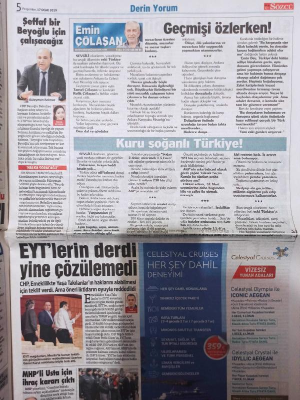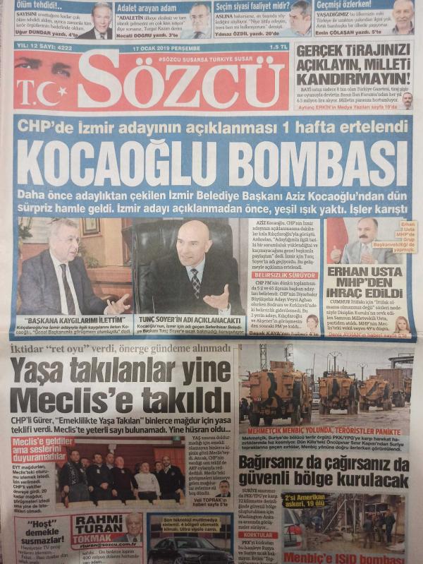 Sözcü Gazetesi - 17 Ocak 2019 - Ertuğrul Akbay - Uğur Dündar - Murat Çetinkaya - İsmail Şahin - Asuman Aranca - İsmail Akduman - Vladimir Putin - Yıpranma, Sararma, Yırtılmalar Zamana Bağlı Olarak Görülebilir.