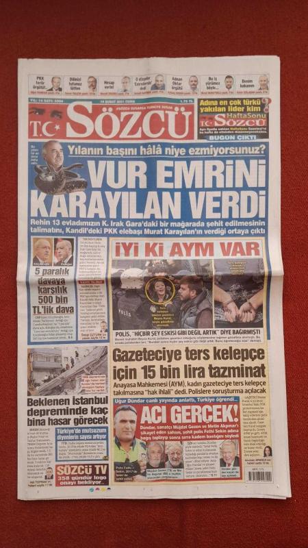 Sözcü Gazetesi 19 Şubat 2021 Vur Emrini Karayılan Verdi,İyi Ki AYM Var,Acı Gerçek,Cüceloğlu'nu Uğurladık,Müthiş Dönüş,Gözler Kağan'da,Dünyanın En İyisi Olabilirim,Yıldızlar Vitrini,Ortaya Kilit Efecan'a Kelepçe,Sabrın Sonu Ersin,Süper Lig'in Tacı Yalçın'ın adlı eser, Kitap > Süreli Yayınlar > Gazeteler > Türkiye > Genel > Günlük kategorisinde İkinci El olarak satıştadır.