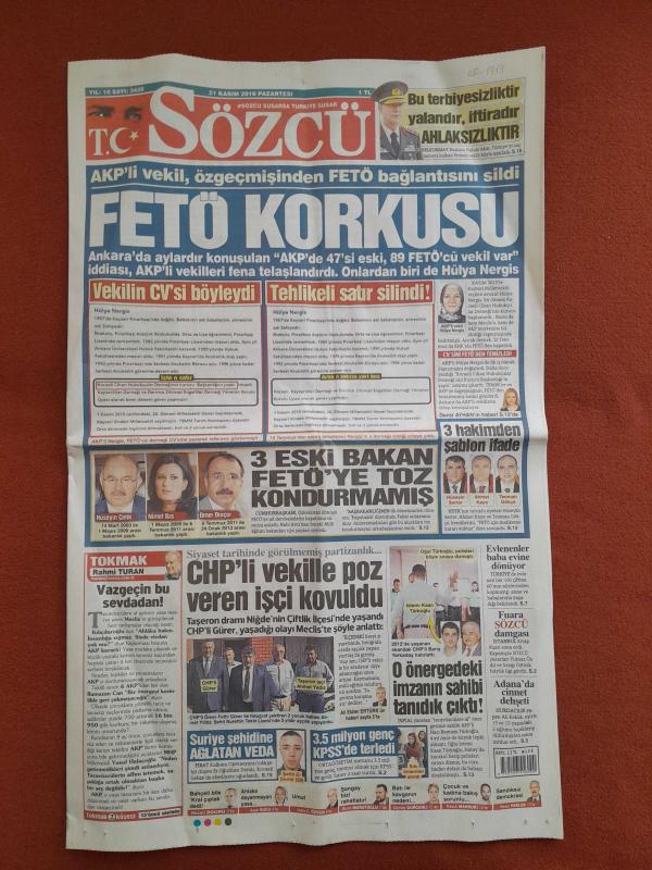 Kitap 2016 yılında yayınlanmıştır. 20 sayfadır. Sözcü Gazetesi 21 Kasım 2016 FETÖ Korkusu,3 Eski Bakan FETÖ'ye Toz Kondurmamış,CHP'li Vekille Poz Veren İşçi Kovuldu,Zirve Takibi,Bey Değil Bye,Bruma İçin 26 Milyon€,Benfica Affetmez,Vakıfbank Çok Rahat,Kadıköy'de Ezeli Eziyet,Uçuran Hollandalı,Yarım Şans Vermedik,Üçlü Çektirelim Sabri adlı eser Türkçe dilindedir.