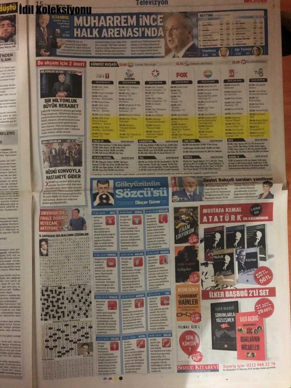 Sözcü Gazetesi, 22 Haziran 2018, Uğur Dundar, Bekir Coşkun, Yılmaz Özdil, Emin Çolasan, Rahmi Turan, Aytunç Erkin, Gökmen Ulu, Meral Akşener, Kamil Elibol, Kılıçdaroğlu, Bahçeli, Yıldırım, Tansel Çolak, O Mektup, İzmir Mitingi, Şeyh Sait ve Seyit Rıza, Patates ve Soğan, Meral Akşener'in Açıklamaları, Erdoğan'ın Mitingleri, Kılıçdaroğlu'nun Reytingi, Beyaz Eşyanın Tarihi, ADD'den Son Çağrı, Polonyah, Alya, Sam, Farfan, Solano, Comolli, Barce, Calles, Jörgensen, Poulsen, Eriksen, Jedinak, Mbappe, Gallese, Advincula, Ramos, Rodriguez, Santamaria, Trauco, Aquino, Yotun, Farfan, Guerrero, Caballero, Messi, Dybala, Higuain, Subasic, Vrsaljko, Strinic, Lovren, Vida, Perisic, Kovacic, Rakitic, Modric, Brozovic, Mandzukic, Corluka, Rebic, Yilmaz, Yusuf Namoğlu, Yildirim Demiren, Abdullah Yilmaz, Clifin Francis adlı eser, Kitap > Süreli Yayınlar > Gazeteler kategorisinde İkinci El olarak satıştadır.