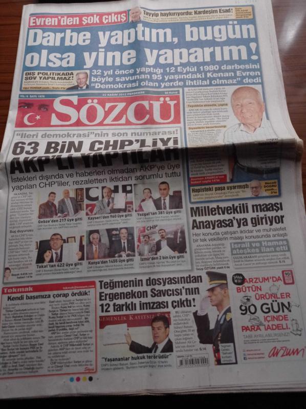 Sözcü Gazetesi - 22 Kasım 2012 - İngiliz Basını Galatasaray'ı Göklere Çıkardı - UEFA Avrupa Ligi - Kenan Evren'den Son Çıkış Darbe Yaptım Bugün Olsa Yine Yaparım - 63 Bin CHP'liyi AKP'li Yaptılar - Teğmen Mehmet Ali Çelebi'nin Dosyasından Ergenekon Savcısının 12 Farklı İmzası Çıktı adlı eser Türkçe dilindedir.