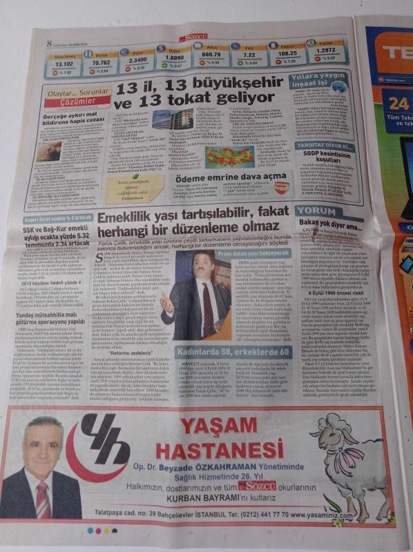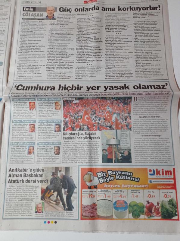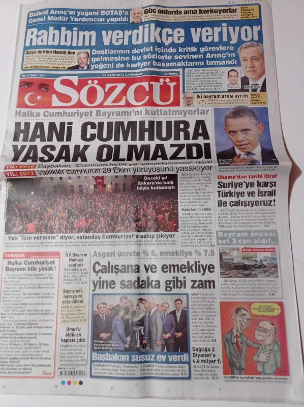 Sözcü Gazetesi - 24 Ekim 2012 - Halka Cumhuriyet Bayramı Kutlatmıyorlar - Barack Obama'dan Tarihi İtiraf- Bülent Arınç'ın Yeğeni BOTAŞ'a Genel Müdür Yardımcısı Yapıldı - Çalışana ve Emekliye Yine Sadaka Gibi Zam - Bayram Öncesi Sel 3 Can Aldı - Başbakan Recep Tayyip Erdoğan Susuz Ev Verdi adlı eser Türkçe dilindedir.