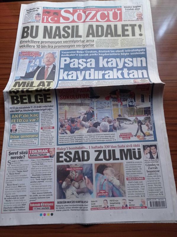 Sözcü Gazetesi - 25 Eylül 2016 - Derbi Faturası Hocalara - Şenol Güneş - Roberto Mancini - İkinci Kez Hacca Giden 530 Dolar Fazla Ödeyecek - Anıtkabir'e Çocuk Parkı Koydular - Beşar Esad Zulmü - AKP'de Kaç FETÖ'cü Var - 17 25 Aralık - Ebru Gündeş Reza Zarrab'tan Boşanıyor adlı eser Türkçe dilindedir.