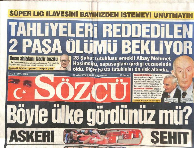 Sözcü Gazetesi 27 Ağustos 2012 - Tahliyeleri Reddedilen İki Paşa Ölümü Bekliyor - ABD İsaac Kasırgası İçin Alarm Durumunda - Alex Mi Kocaman Mı GZ137753, en son 21 gün önce güncellenmiştir.