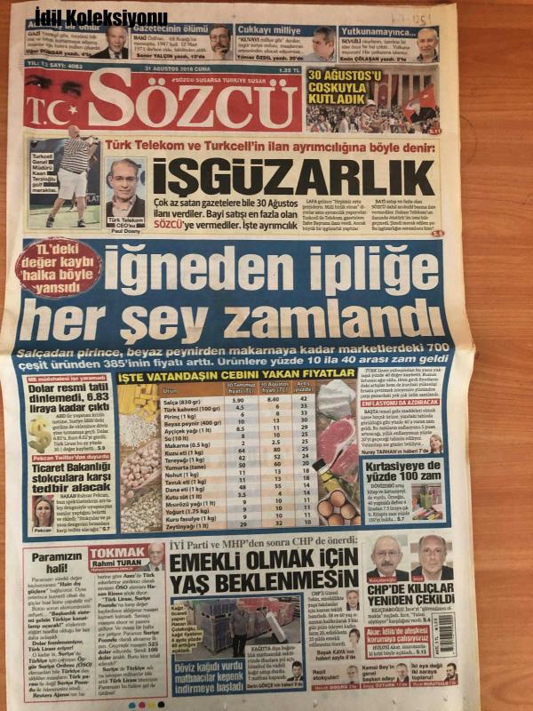 Sözcü Gazetesi, 31 Ağustos 2018, Kemal Kılıçdaroğlu, Erhan Usta, Canan Kaftancıoğlu, Bülent Turan, İğneden İpliğe Her Şey Zamlandı, İşgüzarlık, Kratiseverye de Yüzde 100 Zam, CHP'de Kavgalar Yeniden Alevlendi, Emekli Olmak İçin Yaş Beklemesin, Çocuğu Yanlış Okula Göndermişler, Ticaret Bakanlığı Sıcaklara Karşı Tedbirler Aldı, İşte Vatandaşın Cebini Yakan Fiyatlar, 30 Ağustos'u Coşkuyla Kutladık, Adem Ljajic, Urbano Cairo, Ali Koç, Fikret Orman, Oğuzhan Özyakup, Necip Uysal, Abdullah Gül, Jailson, Ovidiu Hategan, Octavian Sovre, Sebastian Gheorghe, Tolga Zengin, Loris Karius, Utku Yuvakuran, Şeyh Hamad bin Halife Al Tani, Şeyh Temim bin Hamad Al Tani, Erdal Torunoğulları, Ricardo Quaresma, Pepe, Mohammed Al Tani, Bosnak Asıllı Yıldızın Transferinde Mutlu Son Çok Yakın, Ljajic Bitiyor, Ali Koç'tan Jest adlı eser Türkçe dilindedir.