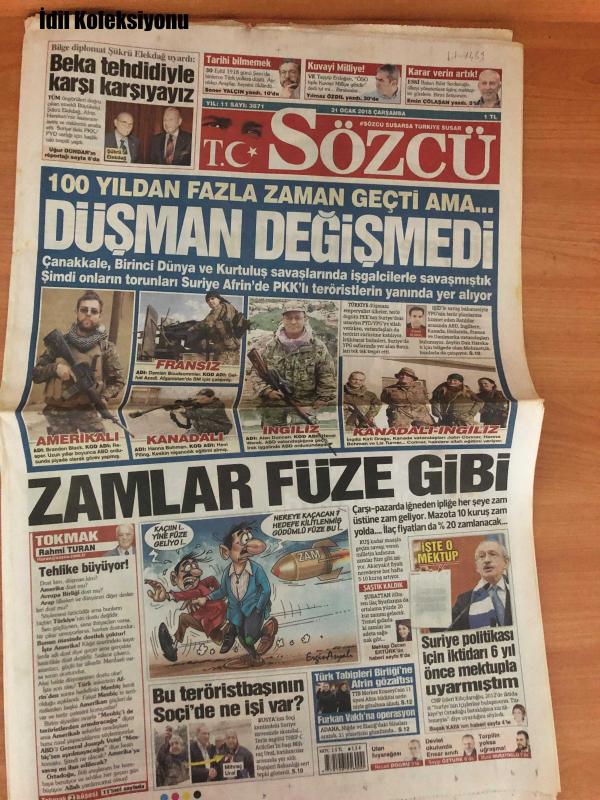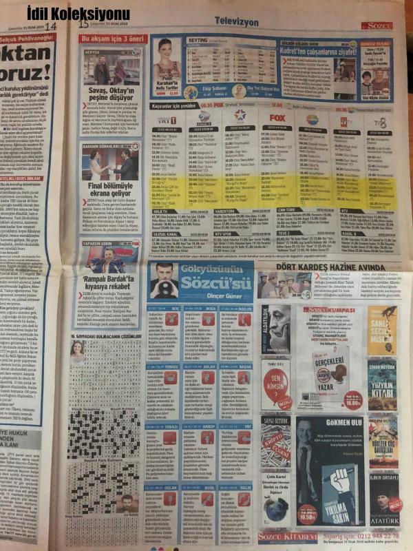 Sözcü Gazetesi, 31 Ocak 2018, Şükrü Elekdağ Uyardı: Tarihi Bilmemek Beka Tehdidiyle Karşı Karşıyayız, Karar Verin Artık!, Zamlar Füze Gibi, Türk Tabipleri Birliği'ne İs tepki Gösterdi, Soçi'de Ne İşi Var?, KKTC, Uyarmıştım, Devlet Okulunda Ulan Hıyar Ağası, Ensar Sınıfı, Torpilin Yoksa Uğraşma, G.Saray'ın Yeni Yönetiminden İki Günde İstifa Eden Celal Açar'dan Olay Sözler: Sessizliğini Bozdu, Sol Bek Doldu ama Orta Saha Düşündürüyor, Nagatomo Bitti, Sıkıntı Sürüyor, Nagatomo Galatasaray'da, Ndiaye Stoke City'de, Dursun Özbek Ne Yapacak?, 'Kramponları Biz Verdik!', Cinar Malines, Devre Arasında Transfer Dönemi Yatmaya Başladı, Giresun e France Ye Kupada Bugun Akhisar-Kayseri, Sivas'a Yeni 10 Numara, Deniz Nakiye Ömür Boyu Men, PFDK'ya Sevk adlı eser Türkçe dilindedir.