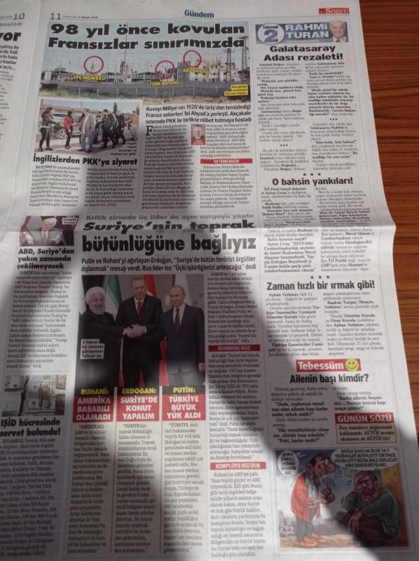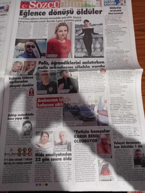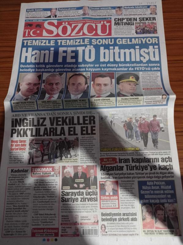 Sözcü Gazetesi - 5 Nisan 2018 - 2015'te Otobüsü Kurşunlanan Fenerbahçe Olayın Peşini Bırakmıyor 3 Yıl Oldu Failler Yok - Ronaldo 2.38 Metreye Yükselerek Attığı Gol Tarihe Geçti - Cumhuriyet Halk Partisi'nden Şeker Mitingi - Temizle Temizle Sonu Gelmiyor Hani FETÖ Bitmişti - İran Kapılarını Açtı Afganlar Türkiye'ye Kaçtı - Alparslan Türkeş Anıldı - Ajda Pekkan - Müjdat Gezen - Hülya Avşar - Sarayda Üçlü Suriye zirvesi adlı eser Türkçe dilindedir.
