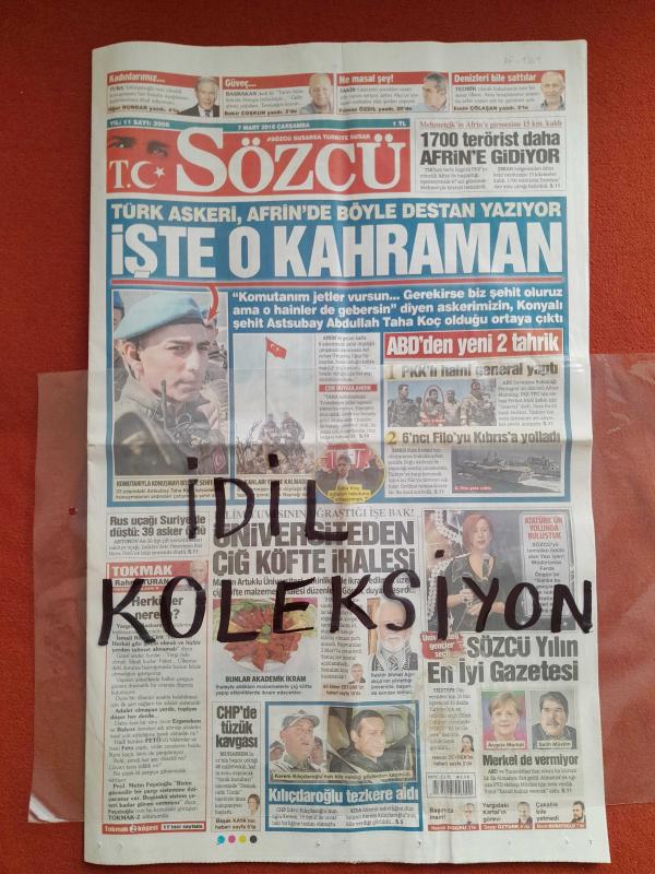 Sözcü Gazetesi 7 Mart 2018 Türk Askeri Afrin'de Böyle Destan Yazıyor,1700 Terörist Daha Afrin'e Gidiyor,Dişi Aslan Geri Döndü,Daçka Hata Yapmadı,Üc Silahşorlar,Kale Düştü,Kurtuluş Planı,Quaresma Rövanşa Yetişiyor,Gomis'ten İyisi Yok adlı eser, Kitap > Süreli Yayınlar > Gazeteler > Türkiye > Genel > Günlük kategorisinde İkinci El olarak satıştadır.