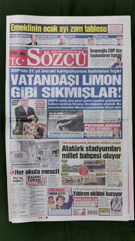 Sözcü Gazetesi 8 Aralık 2018 Mahmut Tanal,Angela Merkel,Tuncay Özilhan,Mesut Özil,Fikret Orman,Mustafa Cengiz,Ricardo Quaresma,Loris Karius,Domagoj Vida,Şenol Güneş,Tümer Metin,Ersun Yanal,Islam Slimani,Mathieu Valbuena,Bobby Dixon,Ozan Kabak,Fatih Terim,Aleksis Çipras,Vladimir Putin,Ahmet Davutoğlu,Hakan Fidan,Erol Bilecik,Andre Ayew adlı eser, Kitap > Süreli Yayınlar > Gazeteler > Türkiye > Genel > Günlük kategorisinde İkinci El olarak satıştadır.