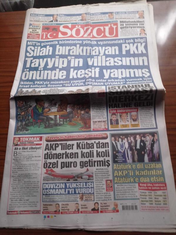 Sözcü Gazetesi - 8 Mart 2015 - Fenerbahçe Galatasaray Derbisi - Silah Bırakmayan PKK Recep Tayyip Erdoğan'ın Villasının Önünde Keşif Yaomis- Atatürk'e Dil Uzatan AKP'li Kadınlar Atatürk'e Dua Etsin - AKP'liler Küba'dan Dönerken Koli Koli Özel Puro Getirmiş adlı eser Türkçe dilindedir.