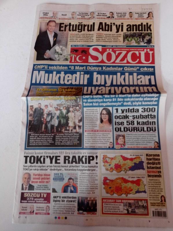 Sözcü Gazetesi - 8 Mart 2021 - Demba Ba'dan Hayat Öpücüğü - Radamel Falcao - CHP'li Vekil Sera Kadıgil'den 8 Mart Dünya Kadınlar Günü Çıkışı - 1 Yılda 300 Ocak Şubat'ta İse 58 Kadın Öldürüldü - Ertuğrul Akbayı Andık - Korona Haritası Değişti adlı eser Türkçe dilindedir.