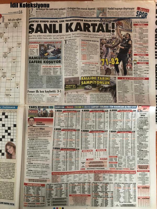 Sözcü Gazetesi, 9 Ekim 2017, Yılmaz Büyükerşen, Saygı Öztürk, Rahmi Turan, Celâl Ülgen, Mehmetçik, Recep Tayyip Erdoğan, Binali Yıldırım, Devlet Bahçeli, Cemil Yaman, Yusuf Toltar, Asuman Aranca, Nurettin Özdebir, Erdoğan Süzer, Vedat Erdem, Kamil Elibol, Ayşe Sucu, Yekta Güngör Özden, Murat Muratoğlu, Zeynep Gürcanlı, Cenk Tosun, Mircea Lucescu, İgor Tudor, Martin Linnes, Mevlüt Erdinç, Bafetimbi Gomis, Elif Elmas, Josef de Souza, Mathieu Valbuena, Alper Potuk, Tuvana Türkay, Aykut Kocaman, Mehmet Topal, Rahmi Özcan, Serkan Dereli, Mustafa Cengiz, Asuman Aranca, Ataman Güneyligil, Mesut Yıldırım, Puan Durumu, Finlandiya-Türkiye, Ukrayna-Hırvatistan, Cenk: Tüm Ülkeyi Üzdük, Mircea Lucescu'nun A Milli Takım İle İlgili Yorumu, Beşiktaş'tan Tarihi Jest, Ampute Milli Takımı'nın Başarısı, Gomis Rekor Kırar adlı eser, Kitap > Süreli Yayınlar > Gazeteler kategorisinde İkinci El olarak satıştadır.