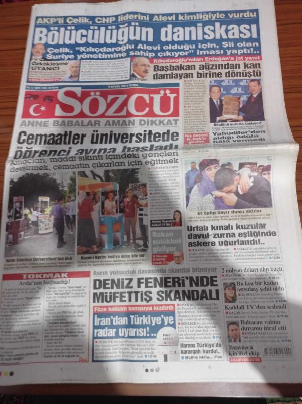Sözcü Gazetesi - 9 Eylül 2011 - Fenerbahçe Samandıra'da Şampiyonluk Yemini Etti - Volkan Demirel - 12 Dev Adam - Hamileler Yarıştı - AKP'li Hüseyin Çelik CHP Liderini Kemal Kılıçdaroğlu'nu Alevî Kimliğiyle Vurdu - Recep Tayyip Erdoğan Yahudiler'den Aldığı Ödülü Hala Vermedi - Cemaatler Üniversitede Öğrenci Avına Başladı - Deniz Feneri'nde Müfettiş Skandalı - İran'dan Türkiye'ye Radar Uyarısı adlı eser Türkçe dilindedir.