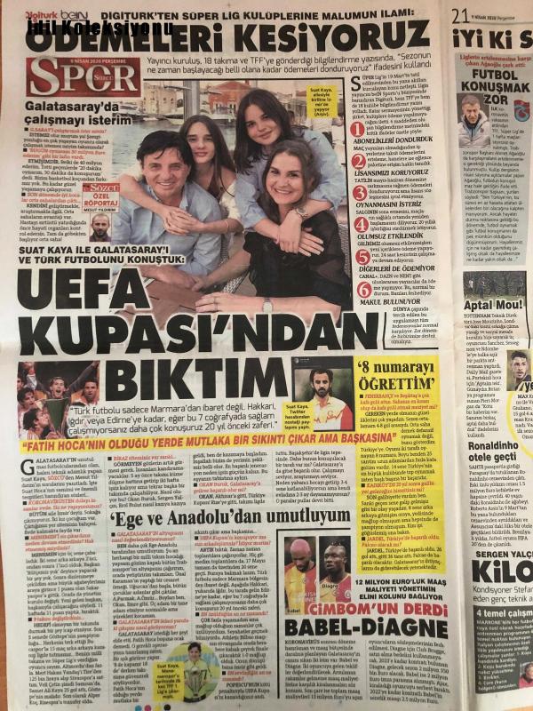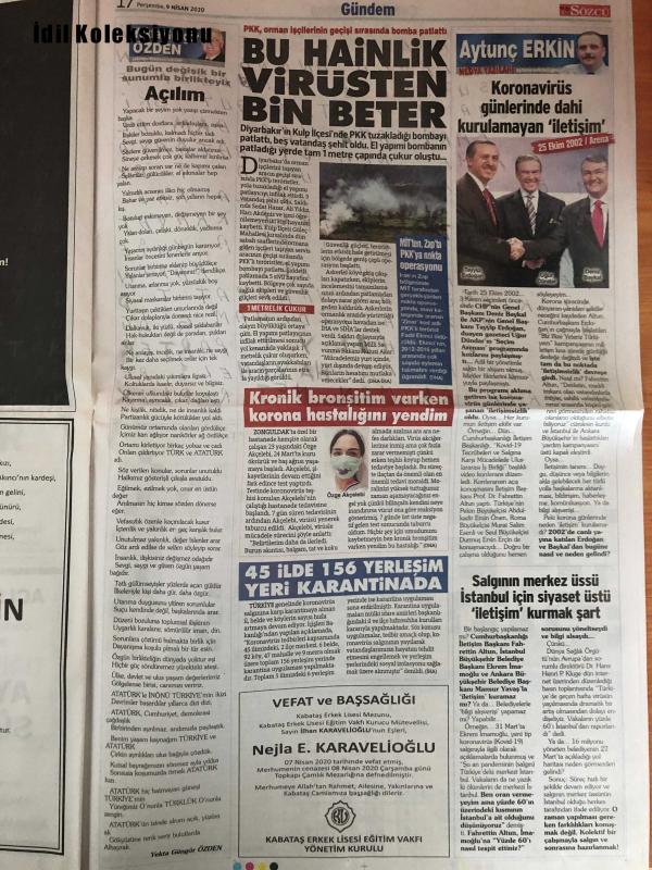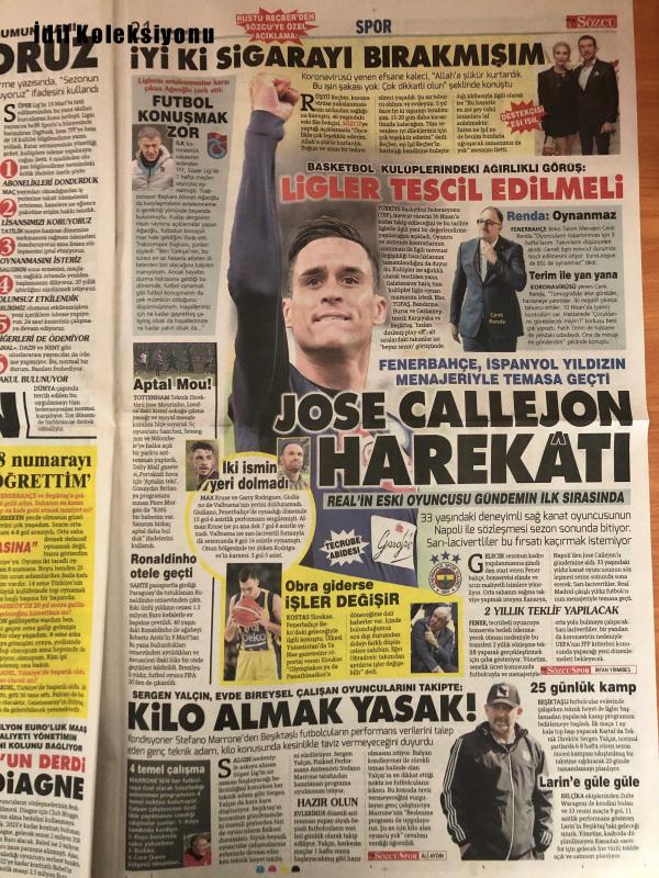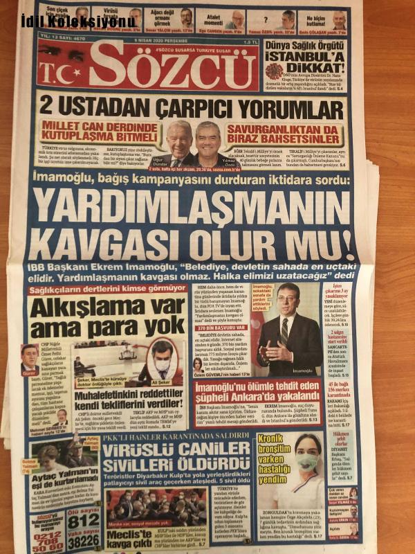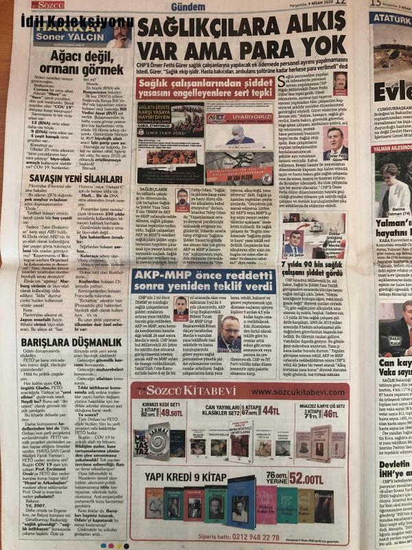 Sözcü Gazetesi, 9 Nisan 2020, Uğur Dündar, Necati Doğru, Soner Yalçın, Emin Çolasan, Yılmaz Özdil, Ege Cansen, Ali Şeker, Ömer Fethi Gürer, Mehmet Serbes, Belma Yalman, Ekrem İmamoğlu, Aytaç Yalman, Belma Yalman, Özge Akçelebi, Serpil Yılmaz, Aytung Erkin, Yekta Q. Ozden, Ahmet Ağaoğlu, Jose Mourinho, Sanchez, Sessegnon, Ndombele, Ronaldinho, Roberto Assis, Jose Callejon, Max Kruse, Garry Rodrigues, Stefano Marrone, Sergen Yalçın, Irfan Yirmibeş, Ali Aydın, Cenk Renda, Sloukas, Larin, Yayıncıdan Kulüplere Bilgilendirme Yazısı, Futbol Konuşmak Zor, Aptal Mou!, Sigarayı Bırakmanın Önemi, Liglerin Tescili, Tecrübe Abidesi, Obra Giderse İşler Değişir, Jose Callejon Hareketi, Oynanmaz, Kilogram Kontrolü, Evde Bireysel Çalışma, 25 Günlük Kamp, Larin'e Güle Güle adlı eser, Kitap > Süreli Yayınlar > Gazeteler kategorisinde İkinci El olarak satıştadır.