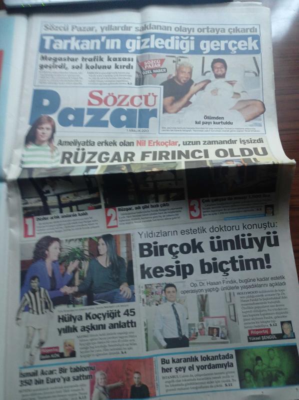 Sözcü Pazar Gazetesi - 1 Aralık 2013 - Tarkan'ın Gizlediği Gerçek Megastar Trafik Kazası Geçirdi Sol Kolunu Kırdı - Ameliyatla Erkek Olan Nil Erkoçlar Rüzgar Fırıncı Oldu - Hülya Koçyiğit Selim Soydan'la 45 Yıllık Aşkını Anlattı - Yıldızların Estetik Doktoru Hasan Fındık Birçok Ünlüyü Kestim Biçtim adlı eser Türkçe dilindedir.