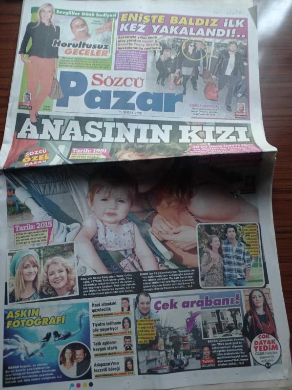 Sözcü Pazar Gazetesi - 15 Şubat 2015 - Nazan Öncel Enişte Baldız İlk Kez Yakalandı - Vip Turizm Yönetim Kurulu Başkanı Ceylan Pirinççioğlu 'na Sevgililer Günü Hediyesi Ameliyat - Suna Yıldızoğlu Ve Kızı Yasemin Allen Fotoğrafı - Özlem Tekin Çok Dayak Yedim - Kenan Doğulu Ve Beren Saat Aşkın Fotoğrafı - Şahan Gökbakar adlı eser Türkçe dilindedir.