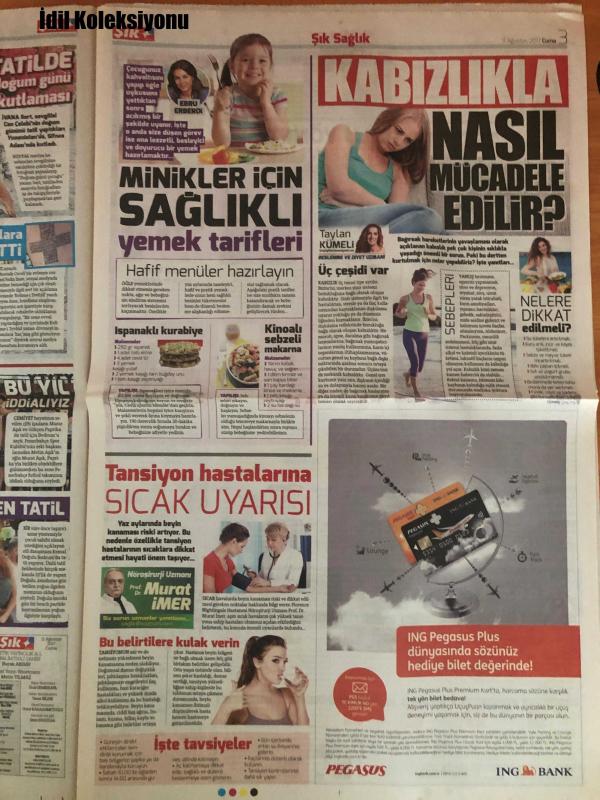 Sözcü Şık Gazetesi, 11 Ağustos 2017, Yıldız Asyalı, Emre Vatansever, Ayşe Mira Vatansever, Ebru Erberdi, Melisa Sözen, Genco Erkal, Tilbe Saran, Engin Hepileri, Cem Davran, Damla Sönmez, Ekin Koç, Sinan Tuzcu, Betül Demir, Sibel Tüzün, Birce Akalay, Can Tunalı, Murat Boz, Aslı Enver, Demet Akalın, Okan Kurt, Osman Görgülü, Emre Çevik, Erol Evgin, Yalın, Nadide Sultan, Candan Erçetin, Gümüşlük'te Denize Giren Asyalı, Bebeklerin Öğle Yemeği Nasıl Olmalı, Yıldızlar Dizide Buluşuyor, Herkes Kendini Kraliçe Sanıyor, Müjdeyi Bodrum'da Verdi, Kabızlıkla Nasıl Başa Çıkılır?, Tansiyon Hastalarına Sıcak Uyarısı, Birce Yüzdü, Sevgilisi Gizlendi, Birlikteyiz Mesajı, Demet Akalın'a Haciz Şoku, 36 Yıl Sonra Turneye Çıkıyor, Bebek'e Taşındı, Her Şehre Bir Aşevi, Duygularıma İstanbul Yön Veriyor adlı eser, Kitap > Süreli Yayınlar > Gazeteler kategorisinde İkinci El olarak satıştadır.