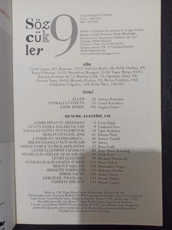Sözcükler Edebiyat Dergisi- Eylül Ekim 2007- Adnan Binyazar- Cemil Kavukçu- Aygün Güçer- Ferit Edgü- Umberto Eco- Uğur Kökden- Ayşe Banu Karadağ- Salih Ecer- Barış Özkul- Mukadder Özgeç, Turgay Fişekçi tarafından kaleme alınmıştır. Kitap 2007 yılında yayınlanmıştır. 144 sayfadır. Sözcükler Edebiyat Dergisi- Eylül Ekim 2007- Adnan Binyazar- Cemil Kavukçu- Aygün Güçer- Ferit Edgü- Umberto Eco- Uğur Kökden- Ayşe Banu Karadağ- Salih Ecer- Barış Özkul- Mukadder Özgeç adlı eser Türkçe dilindedir.