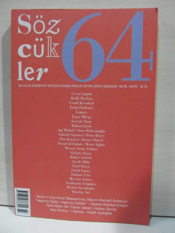 Sözcükler Sayı 64 Veranın Kızı Nazım Hikmet'i Anlatıyor Tarık Akan Kan Kırmızı, . tarafından kaleme alınmıştır. Eser A. Turgay Fişekçi editörlüğünde hazırlanmıştır. Kitap 2016 yılında [İstanbul] yayınlanmıştır. 128 sayfadır. Sözcükler Sayı 64 Veranın Kızı Nazım Hikmet'i Anlatıyor Tarık Akan Kan Kırmızı adlı eser Türkçe dilindedir.