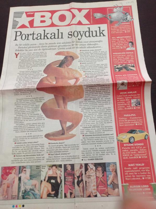 Star Box Gazetesi - 3 Mayıs 2003 - Ünlülerin Selülit Sorunu - Gülben Ergen - Hülya Avşar - Victoria Beckham - Jennifer Lopez - Türkiye Cumhuriyeti'nin İlk Parasını Pulunu Kimin Çizdiğini Biliyor Musunuz - Maça Ası Saddam Hüseyin adlı eser Türkçe dilindedir.