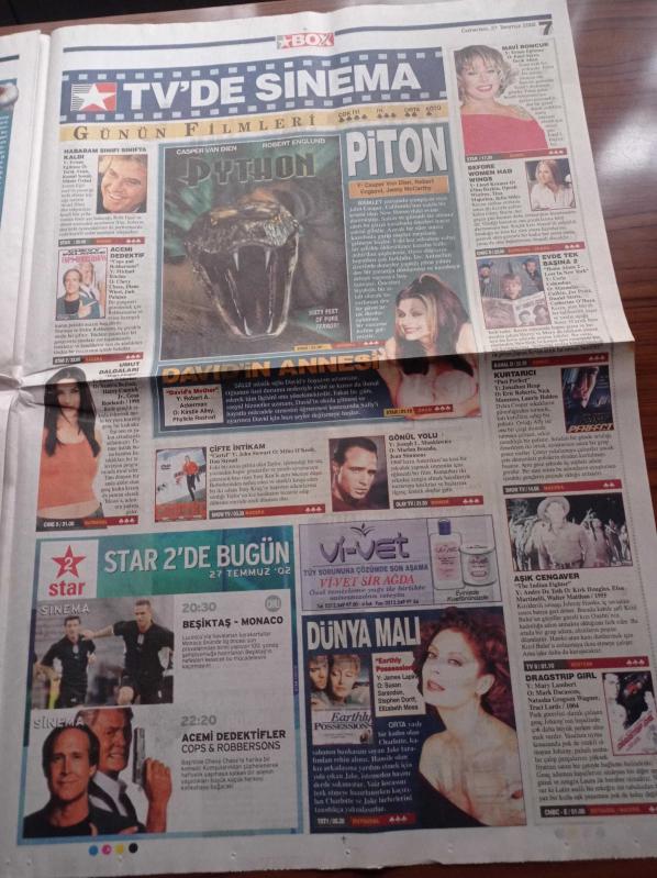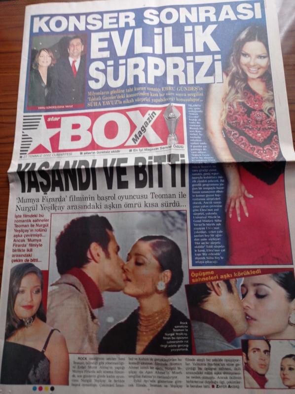 Star Box Magazin Gazetesi - 27 Temmuz 2002 - Ebru Gündeş'e Konser Sonrası Süha Yavuz'dan Evlilik Sürprizi - Mumya Firarda Filmi - Teoman İle Nurgül Yeşilçay'ın Öpüşme Sahnesi - Seksi Vejetaryen Marliece Andrada - Biri Bizi Gözetliyor - Hababam Sınıfı Sınıfta Kaldı - Tarık Akan - Emel Sayın - Ertem Eğilmez adlı eser Türkçe dilindedir.