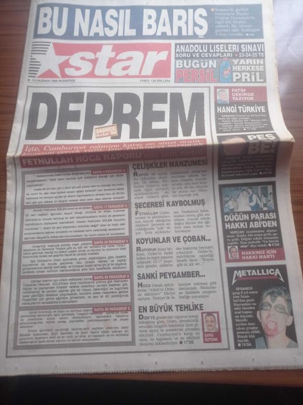 Star Gazetesi - 14 Haziran 1999 - Fatih Akyel Okan Buruk Savaşı - Galatasaray'da Popescu Krizi - Johnson Preko Fenerbahçe'de - Metallica İstanbul'u Salladı - İşte Cumhuriyet Rejimine Karşı En Sinsi Örgütlenmenin Gerçek Yüzü - İşte Türkiye'yi Sarsacak Fethullah Gülen Hoca Raporu'nun Tam Metni - Fethullah Gülen Sanki Peygamber - Angora Evleri Rezaletinde Son Perde - Kosova'da Gerilim Tırmanıyor - Yıldırım Akbulut adlı eser Türkçe dilindedir.