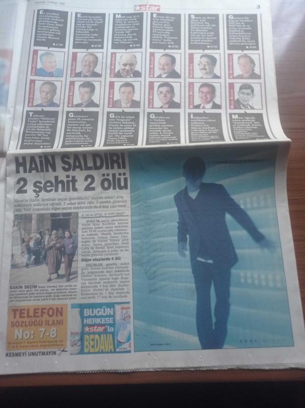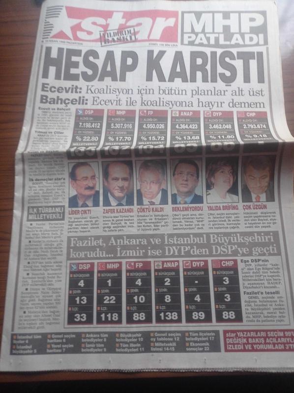 Star Gazetesi - 19 Nisan 1999 - Hakem Ünsal Çimen Çıldırttı - Fenerbahçe Asbaşkanı Abdullah Kiğılı - Beşiktaş'ın Yıldızı Mehmet Özdilek - Ankara'da Melih Gökçek Fark Attı - Mehmet Ağar Seçildi - Seçim Haritası - Yine Çöpte Seçim Pusulaları - MHP Patladı Hesap Karıştı - Devlet Bahçeli Bülent Ecevit'le Koalisyona Hayır Demem - Fazilet Partisi İstanbul Ve Ankara Büyükşehiri Korudu - İlk Türbanlı Milletvekili Merve Safa - Hadep Diyarbakır'ı Kazandı adlı eser Türkçe dilindedir.
