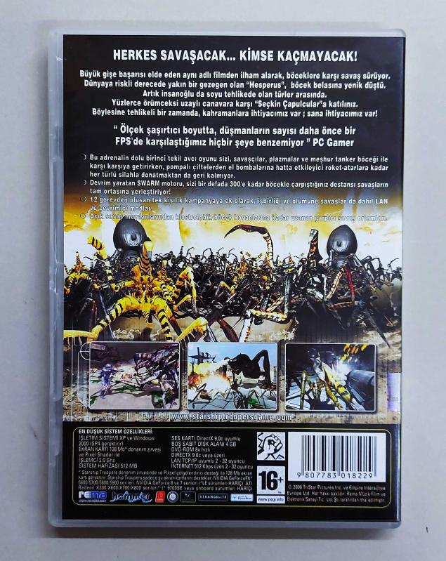2006 yılında piyasaya sürülen Starship Troopers oyunu. Karton ceketli baskıdır. Kutu içeriği eksiksizdir. Oyun içi hikayeyi ve silahları anlatan özel bir kitapçığı mevcuttur. Disk yaşına göre gayet temizdir.Test edilmiştir, sorunsuz çalışmaktadır. Test görüntülerini ilan fotoğraflarından inceleyebilirsiniz. Fiziksel olarak PC DVD koleksiyonu yapanlar ve oyunun hayranları için arşivlik bir üründür.