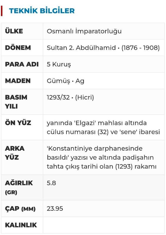 Sultan II. Abdülhamid Dönemi Gümüş 5 Kuruş.. ((Elgazi)) başlıklı ürün, Efemera, Müzik, Sinema > Nümismatik, Para, Madalya > Madeni Paralar > Osmanlı Dönemi > II.Abdülhamit 1293 kategorisi altında İkinci El olarak satılmaktadır.
