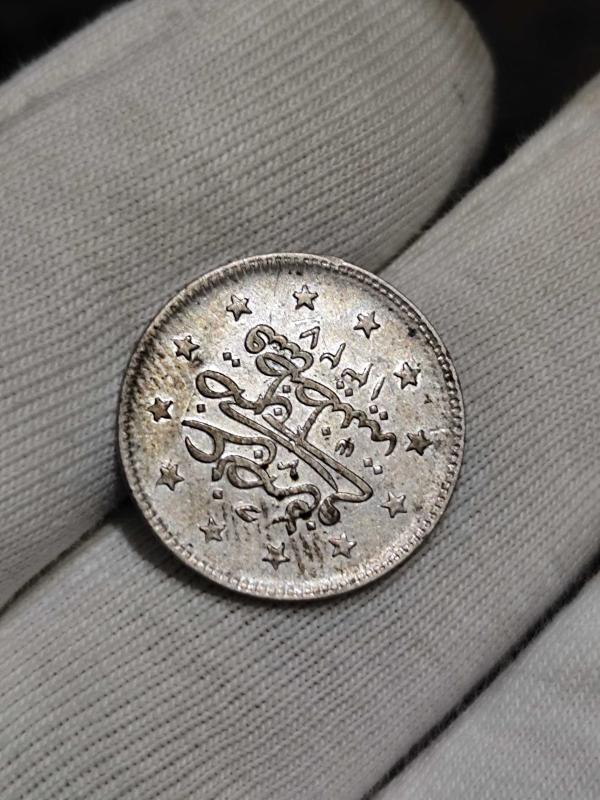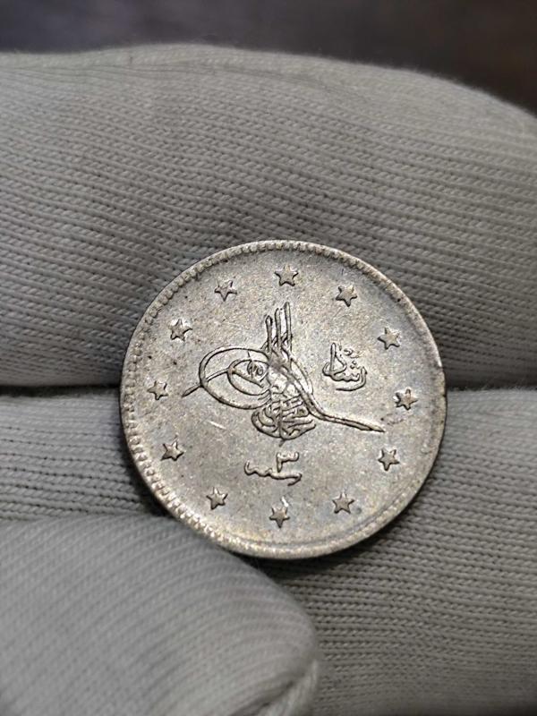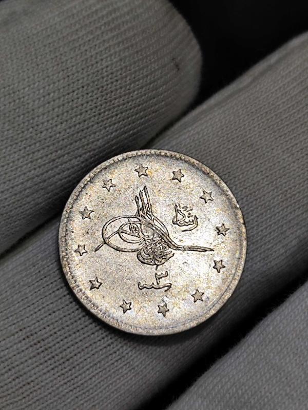 Sultan Reşat 1327/3 Gümüş 2 Kuruş Kenar tırtıkları zayıf kalıp baskıdan dolayı silik çıkmış. Paranın kondisyonunu çile yakın.