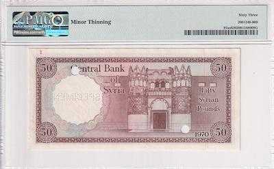 Suriye 50 pound 1966-70 specimen çil. PMG 63 sertifikalı, 11 ay önce satışa sunulmuştur.