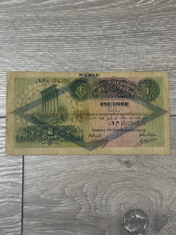 1939 yılı Suriye-Lübnan 1 Livre kağıt para