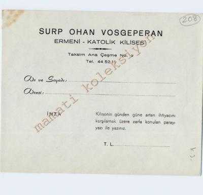 Surp Ohan VOSGEPERAN Ermeni Katolik Kilisesi - Antetli yardım zarfı - Efemera, en son 2 yıl önce güncellenmiştir.